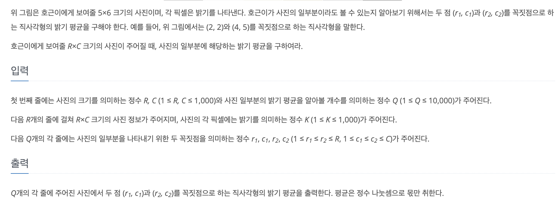 첫 번째 줄에는 사진의 크기를 의미하는 정수 R, C (1 ≤ R, C ≤ 1,000)와 사진 일부분의 밝기 평균을 알아볼 개수를 의미하는 정수 Q (1 ≤ Q ≤ 10,000)가 주어진다. 다음 R개의 줄에 걸쳐 R×C 크기의 사