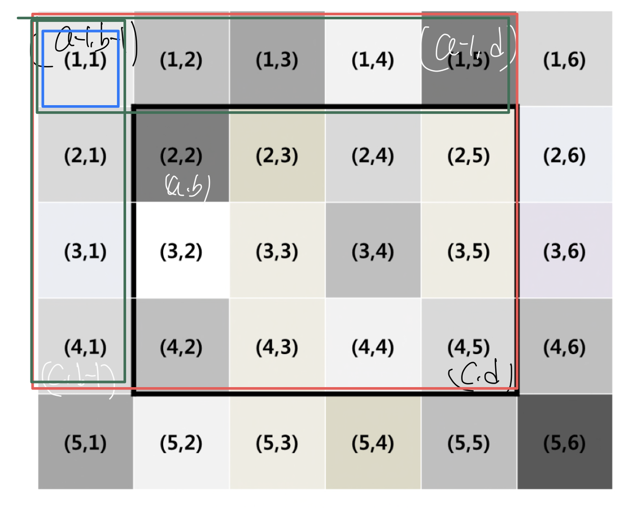 int sum = psum[c][d] - psum[c][b - 1] - psum[a - 1][d] + psum[a - 1][b - 1];