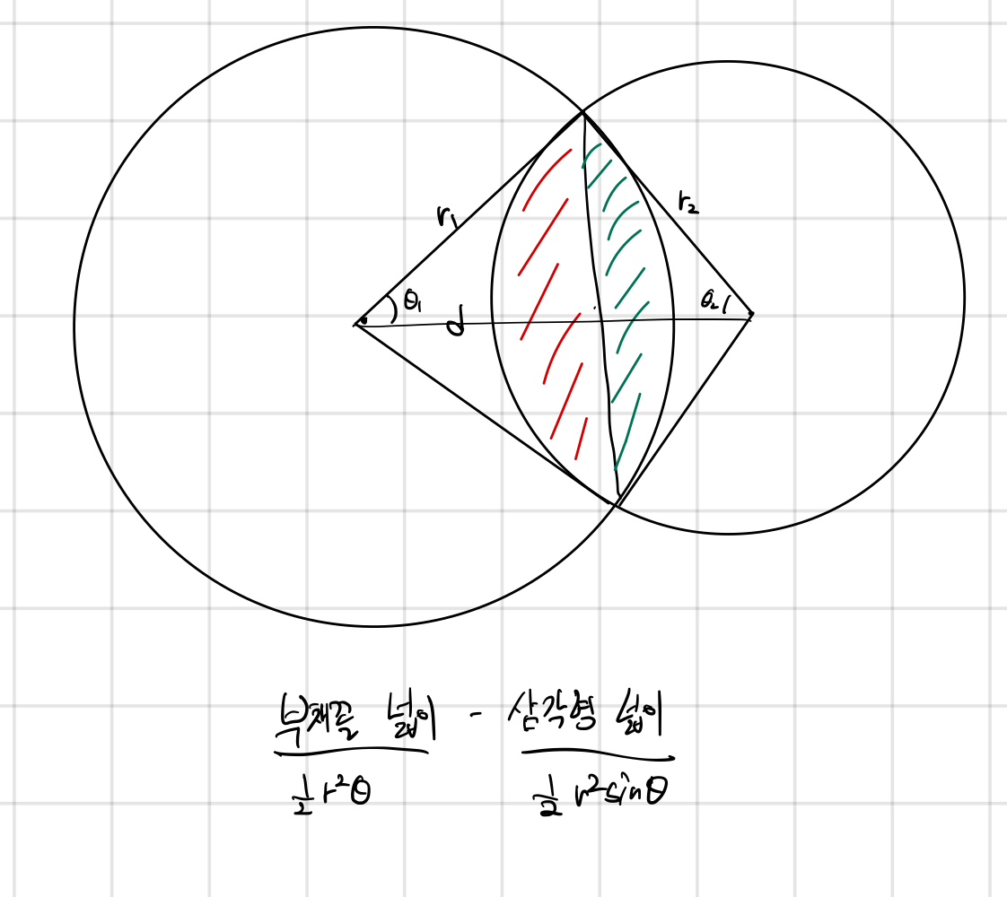 위의 그림과 같이 두 원의 겹친부분 넓이는 부채꼴의 넓이 - 삼각형의 넓이로 구할 수 있다. θ값은 코사인법칙으로 구할 수 있다