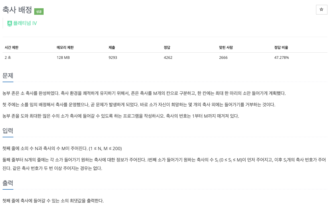 농부 존은 소 축사를 완성하였다. 축사 환경을 쾌적하게 유지하기 위해서, 존은 축사를 M개의 칸으로 구분하고, 한 칸에는 최대 한 마리의 소만 들어가게 계획했다. 첫 주에는 소를 임의 배정해
