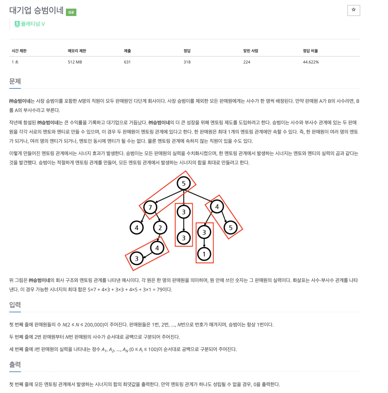 멘티를 한명 이하로만 선택하는 구현을 하기 위해 멘티가 i번째를 멘티로 할 때, (멘티가 하나도 없는 모든 자식 합) - (i가 멘티가 아닐 경우) + (i가 멘티일 경우)를 확인하며 구현한다.