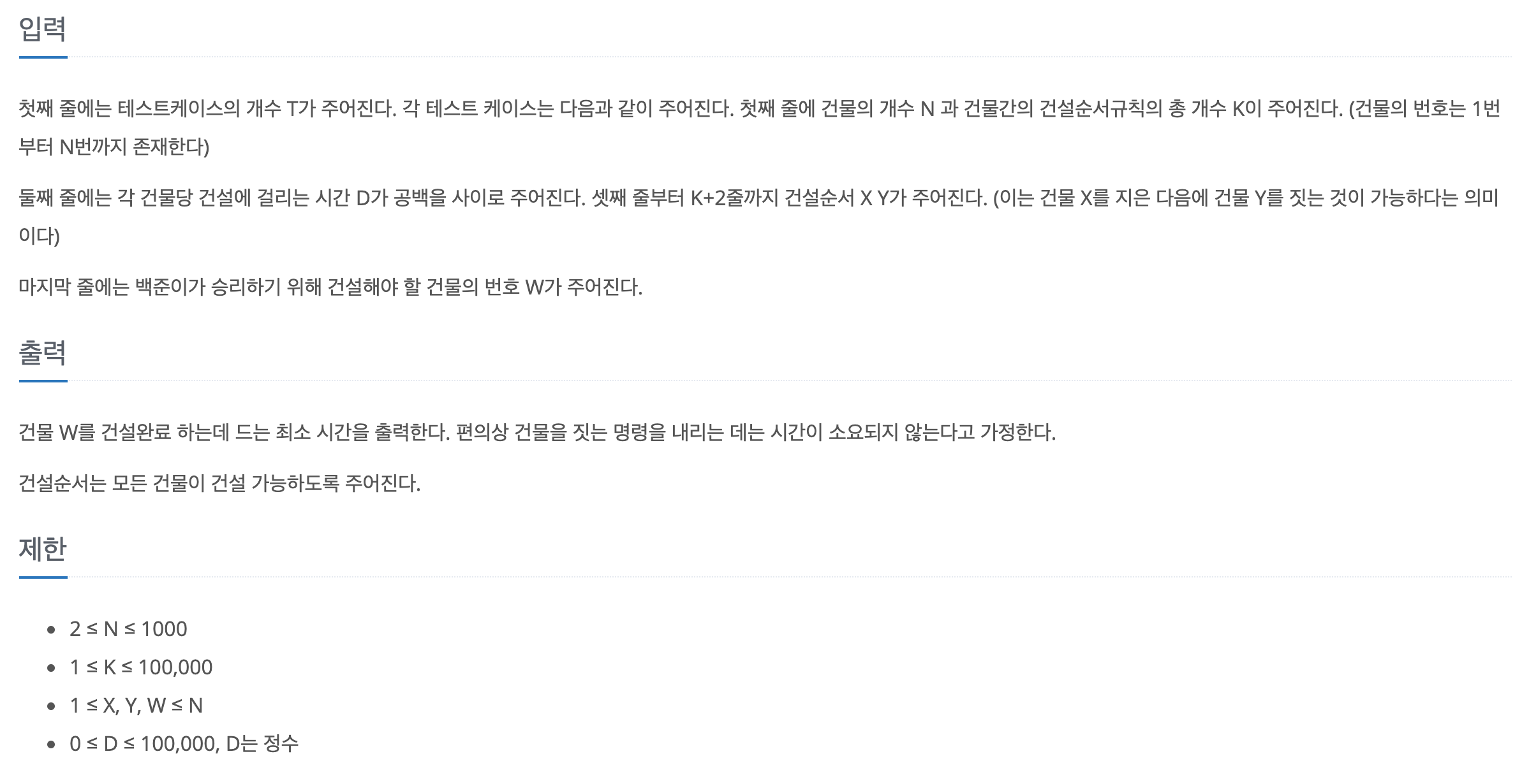 위상 정렬을 이용하여 순서를 찾는 과정에서 dp[nxt] = max(dp[nxt], dp[cur] + dp[nxt])로 특정 노드를 짓기 위한 최소 시간을 구할 수 있다.