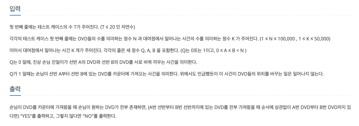 손님이 DVD를 카운터에 가져왔을 때 손님이 원하는 DVD가 전부 존재하면, (A번 선반부터 B번 선반까지에 있는 DVD를 전부 가져왔을 때 순서에 상관없이 A번 DVD부터 B번 DVD까지 있다면) "YES"를 출력하
