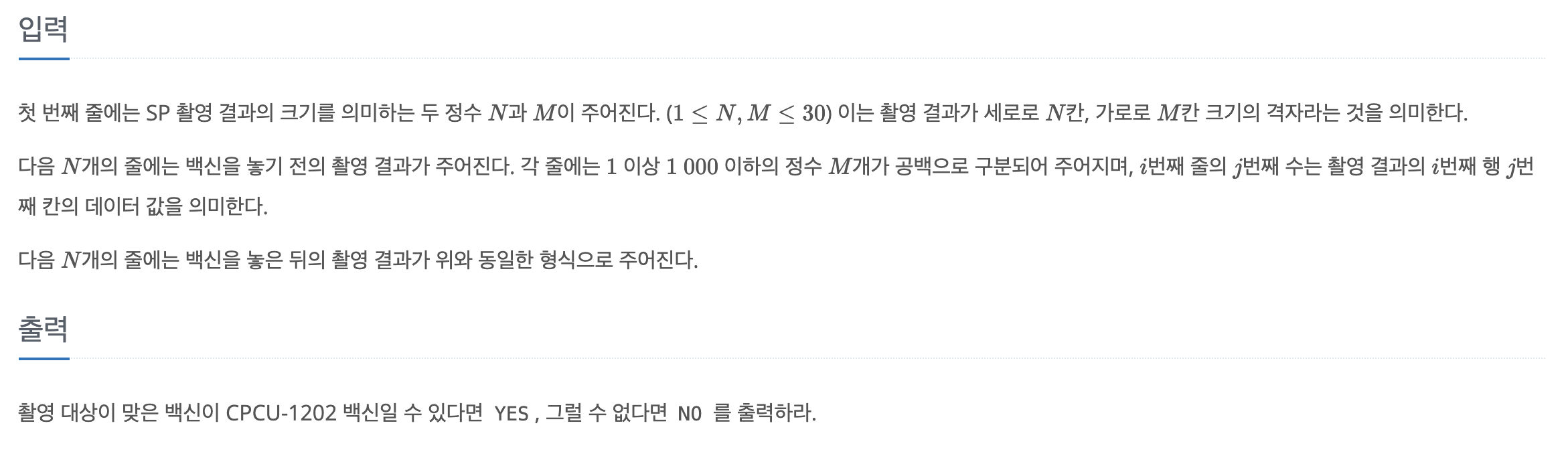 간단한 bfs/dfs문제이다. 붙어있는 같은 데이터들을 모두 탐색하면서, before와 after가 다른 세트가 2세트 이상 있다면 No를 출력하면 되는 문제다. 필자는 bfs로 구현했다.