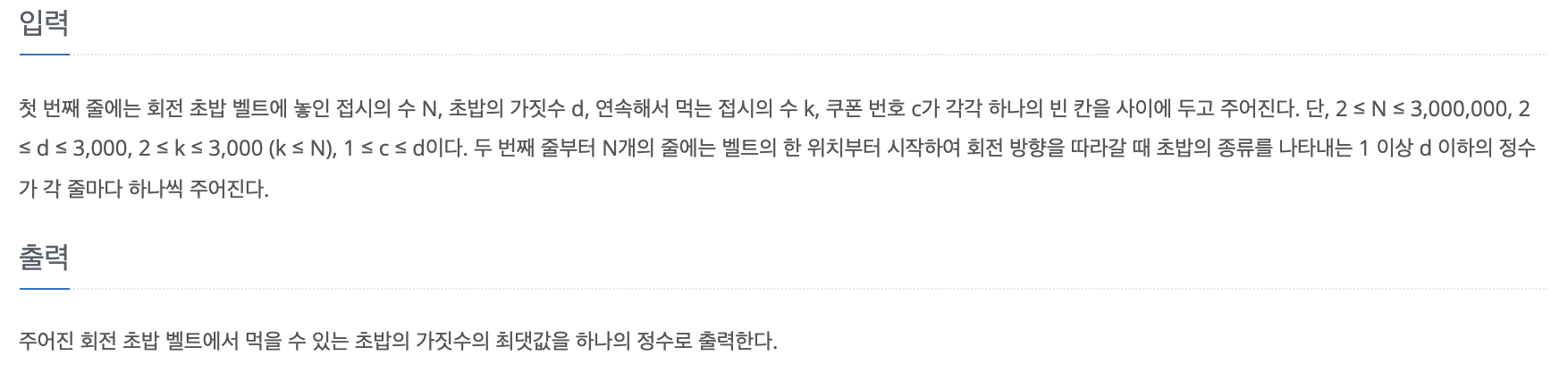 첫 번째 줄에는 회전 초밥 벨트에 놓인 접시의 수 N, 초밥의 가짓수 d, 연속해서 먹는 접시의 수 k, 쿠폰 번호 c가 각각 하나의 빈 칸을 사이에 두고 주어진다. 단, 2 ≤ N ≤ 3,000,000, 2 ≤ d ≤ 3,000, 2